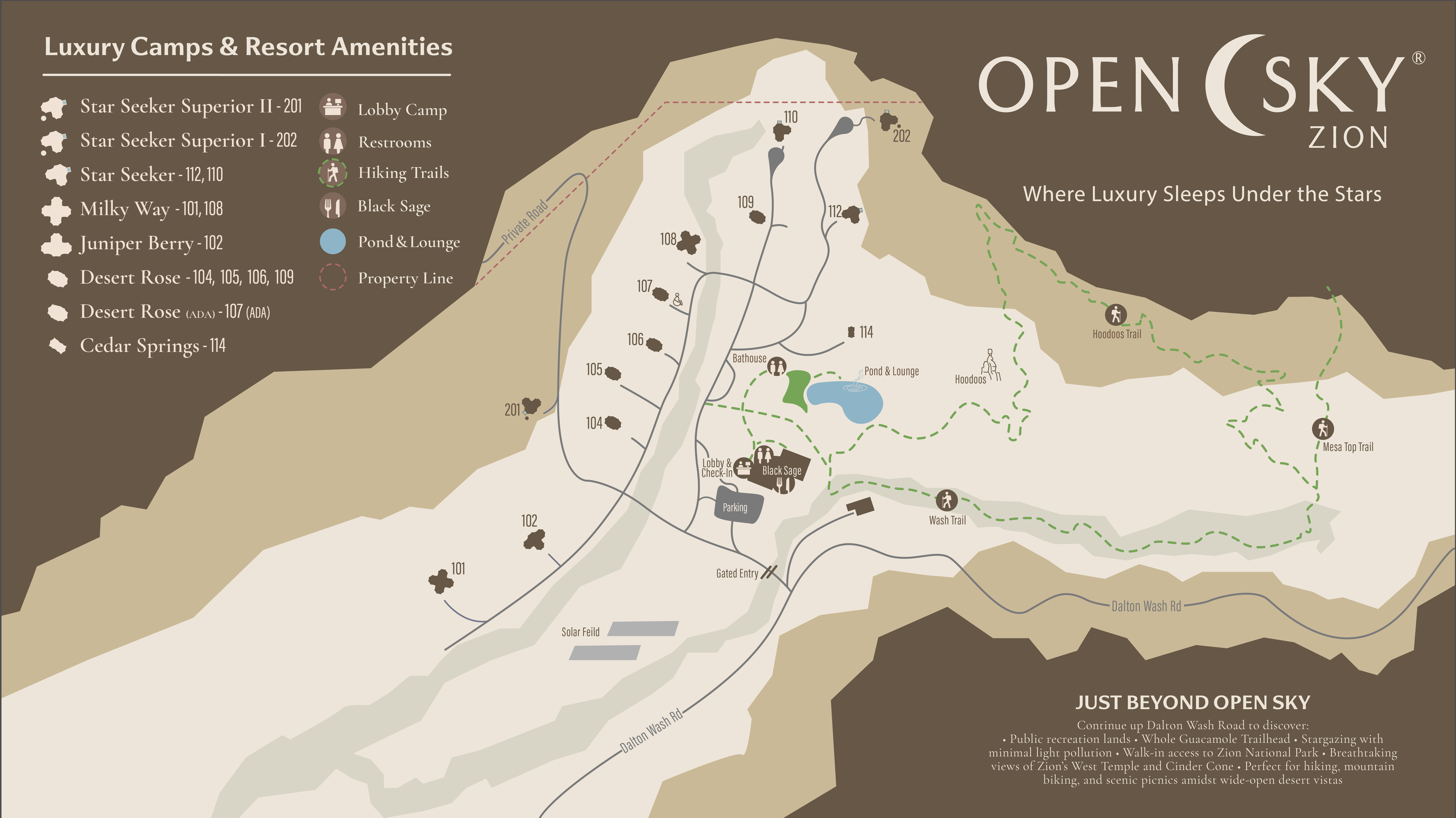 This new luxury camp type at Open Sky is our most expansive of the Star Seeker experiences. This one-of-a-kind camp is elevated in both setting and amenities.